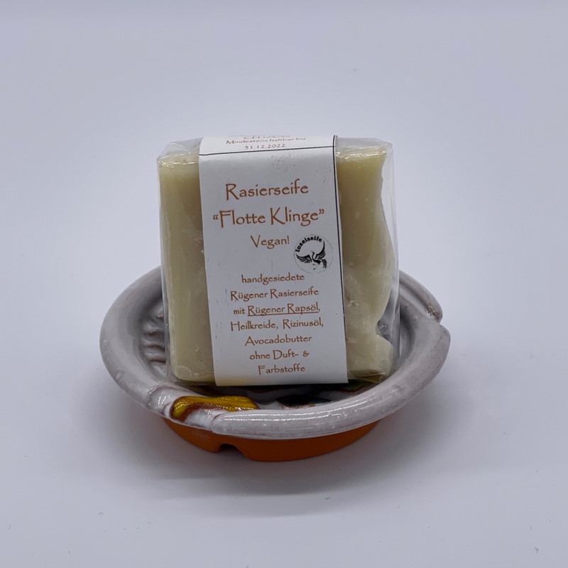 Rasierseife Flotte Klinge im Stück mit Avocadobutter & Rizinusöl Vegan Produktinformation des Herstellers: Eine reichhaltige, pflegende Rasierseife mit schönem Schaum, der guten Rügener Heilkreide zur Versorgung eventueller Wunden (kommt ja doch mal vor…), feinem Babassuöl , seidigem BIO Rizinusöl und das Ganze komplett ohne Duft und Farbe -weil Haut nun mal sehr empfindlich sein kann und im Gesicht sowieso. Vegan.