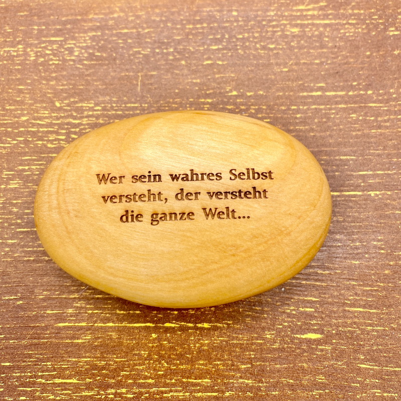 Schöner, matt geschliffener Handschmeichler in Oval-Form aus Naturholz mit Spruch-Gravur. Ein liebenswertes Geschenk zu besonderen Anlässen oder für die kleinen Freuden zwischendurch. Liegt wunderbar in der Hand.
