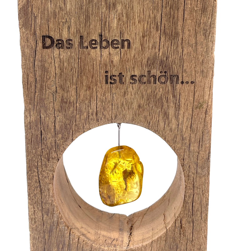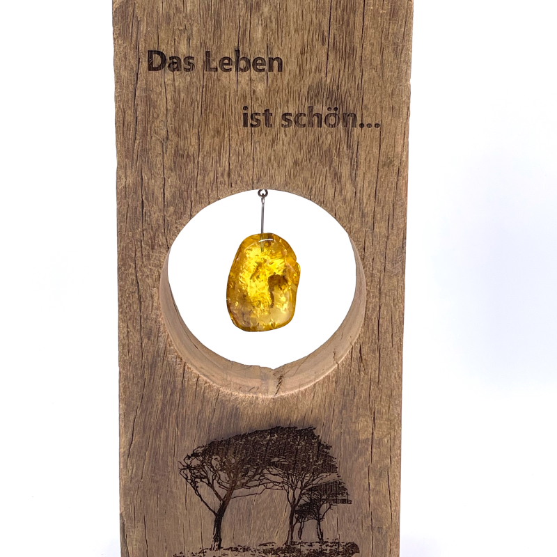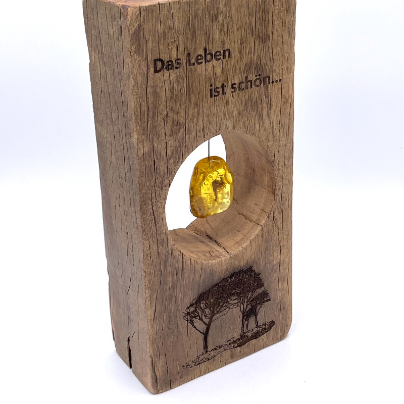 Außergewöhnliche und imposante Holzskulptur mit einer Gravur eines Windflüchters, passendem Zitat und großem leuchtend klaren Bernstein als Sonnenstein aus unserer Werkstatt, gefertigt in Handarbeit. Ein ganz besonderes Geschenk.