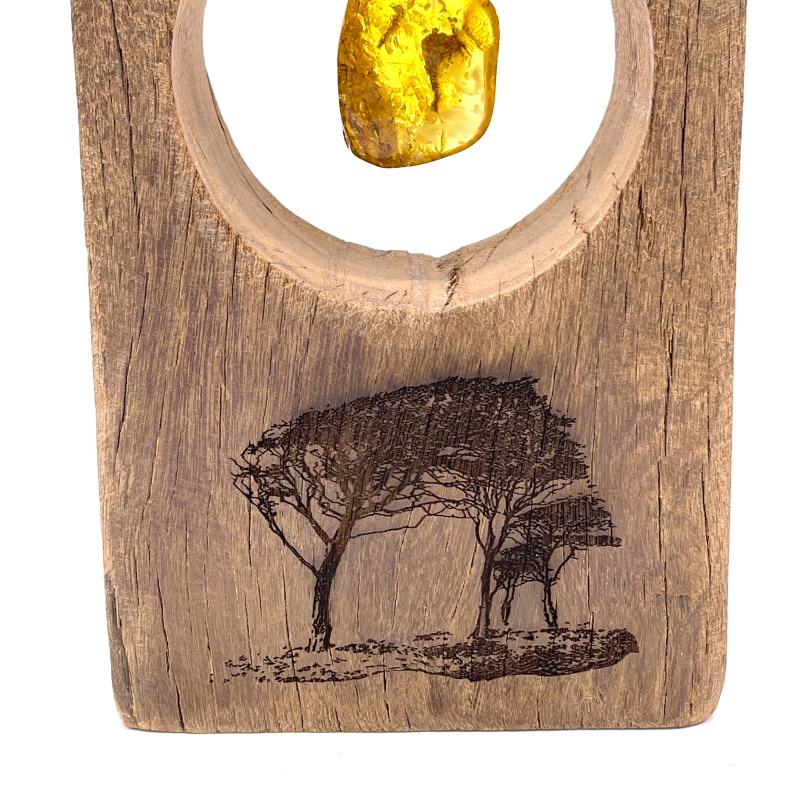 Große Holzskulptur mit Darßer Bernstein und Gravur “Windflüchter”