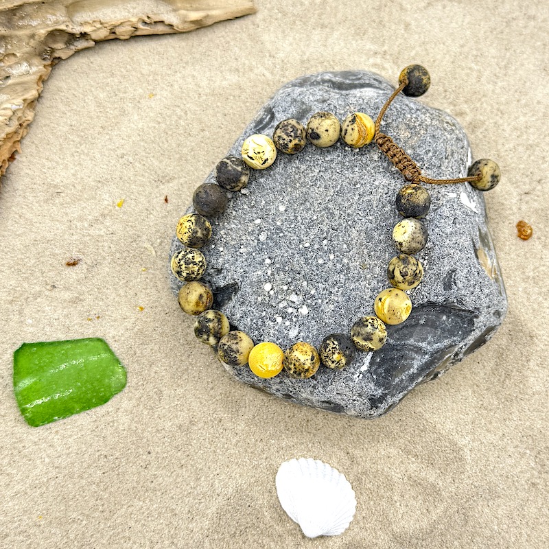 Dieses rustikale, natürlich matte Bernsteinarmband in grün-weißem Moorbernstein gibt einen ursprünglichen, natürlichen Look.
