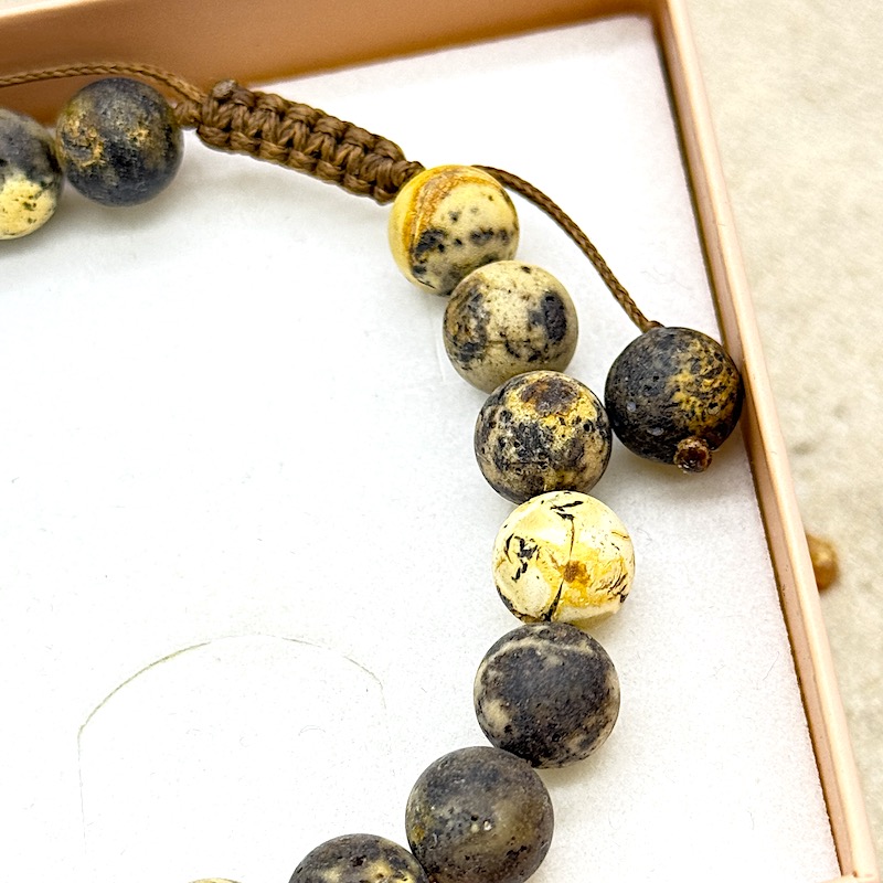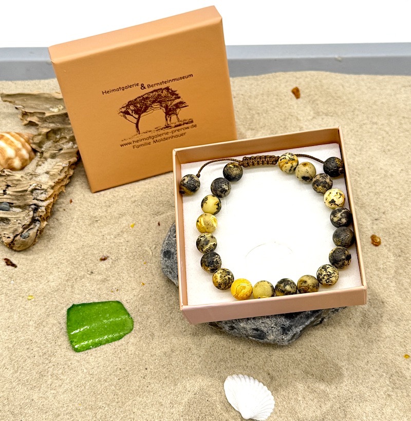 Die beiden Enden des Armbands werden durch zwei Bernsteinkugeln begrenzt und können zur Größenverstellung gezogen werden.