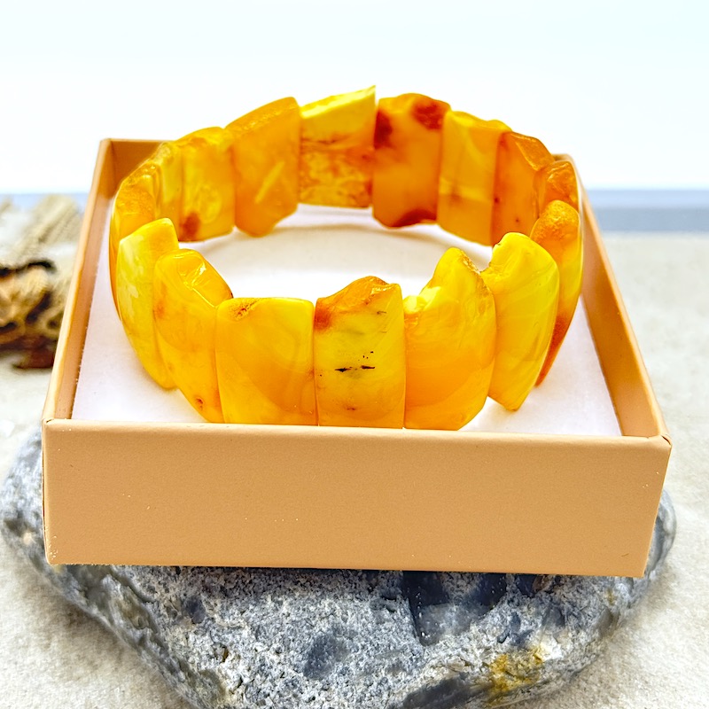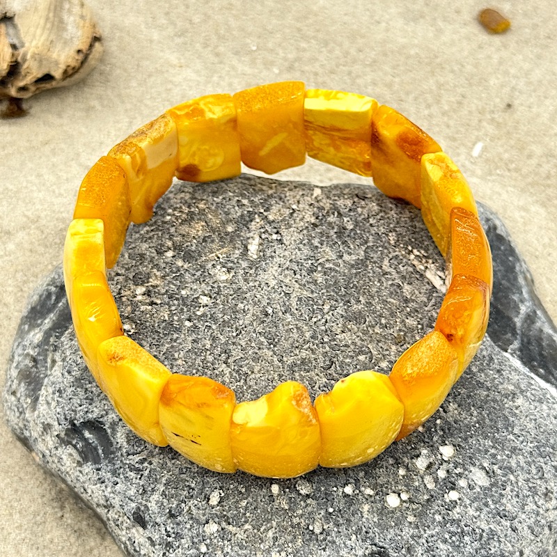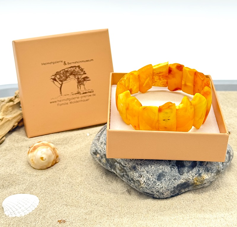 Dieses leuchtend gelbe Bernstein-Armband fängt das Sonnenlicht ein,