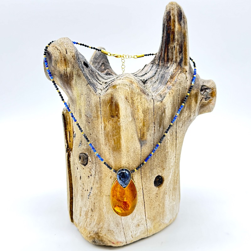 Edles sommerliches Collier mit einem in 925er Sterling Silber-vergoldet eingefassten ovalen Bernstein und einem Sodalith als Schmuck – und Heilstein.