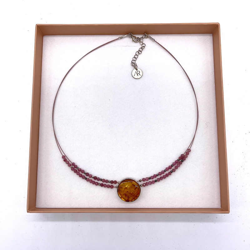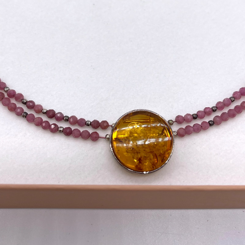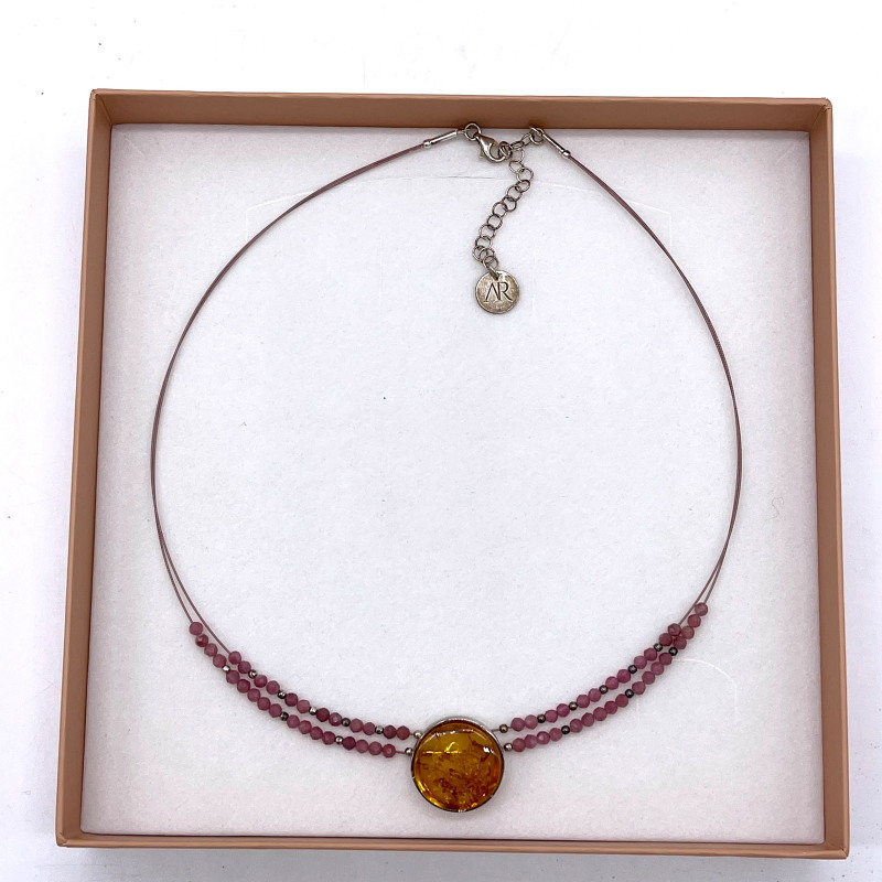 Bernstein-Collier Rosé zweireihig an der Stahlseide mit Perlendetails