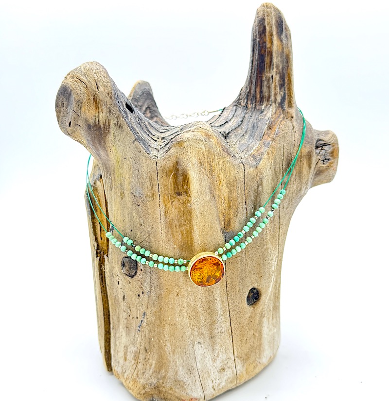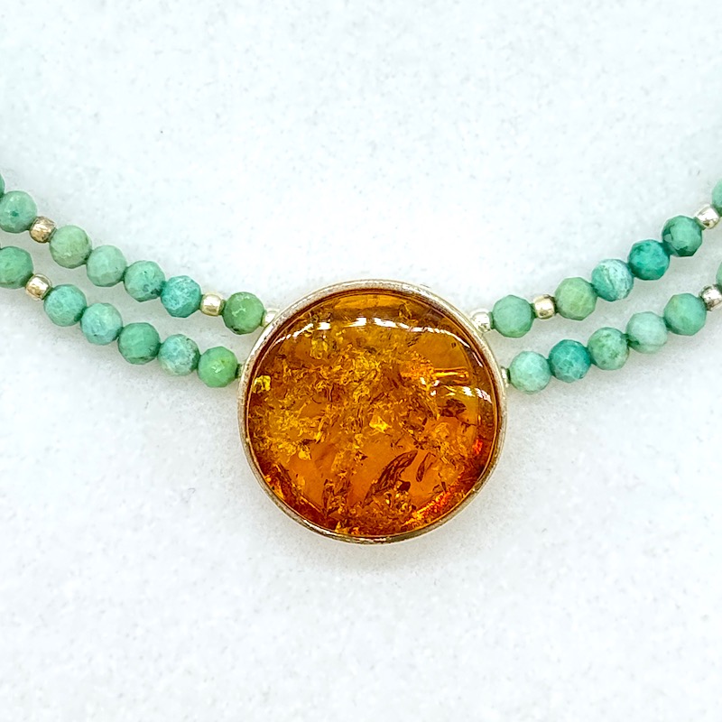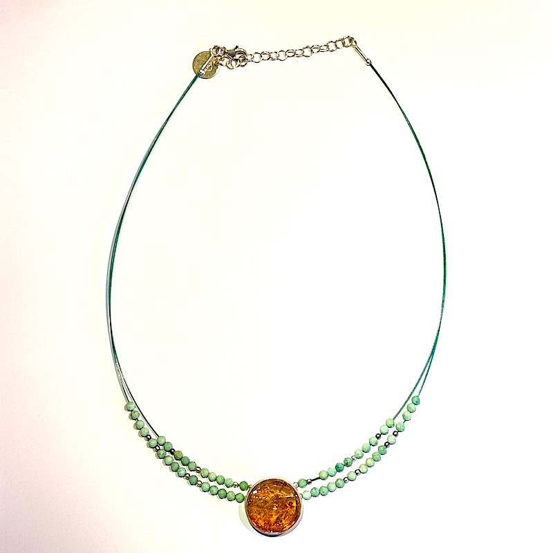 Leuchtendes sommerliches Collier mit einem in 925er Sterling-Silber eingefassten Bernstein-Taler an der zweireihigen Stahlseide mit türkis – und Silberperlen und praktischem Karabinerverschluss inklusive Verlängerungskettchen.