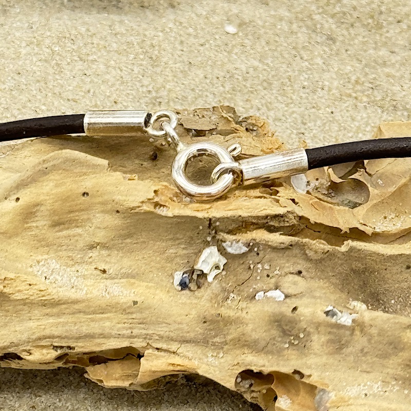 Die Hälfte des Colliers ist Leder und schließt hinten mit einem edlem 925er Sterling Silber Karabiner ab.