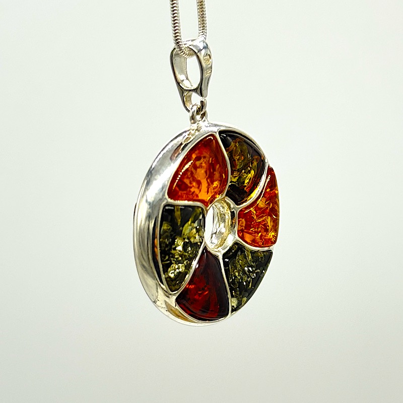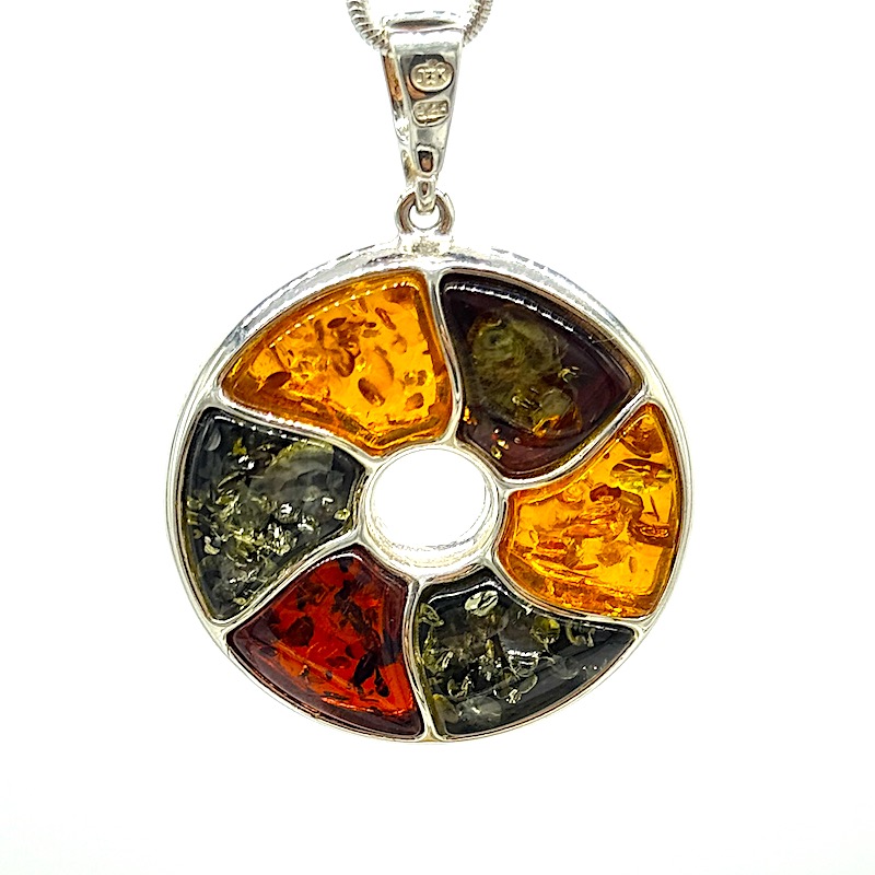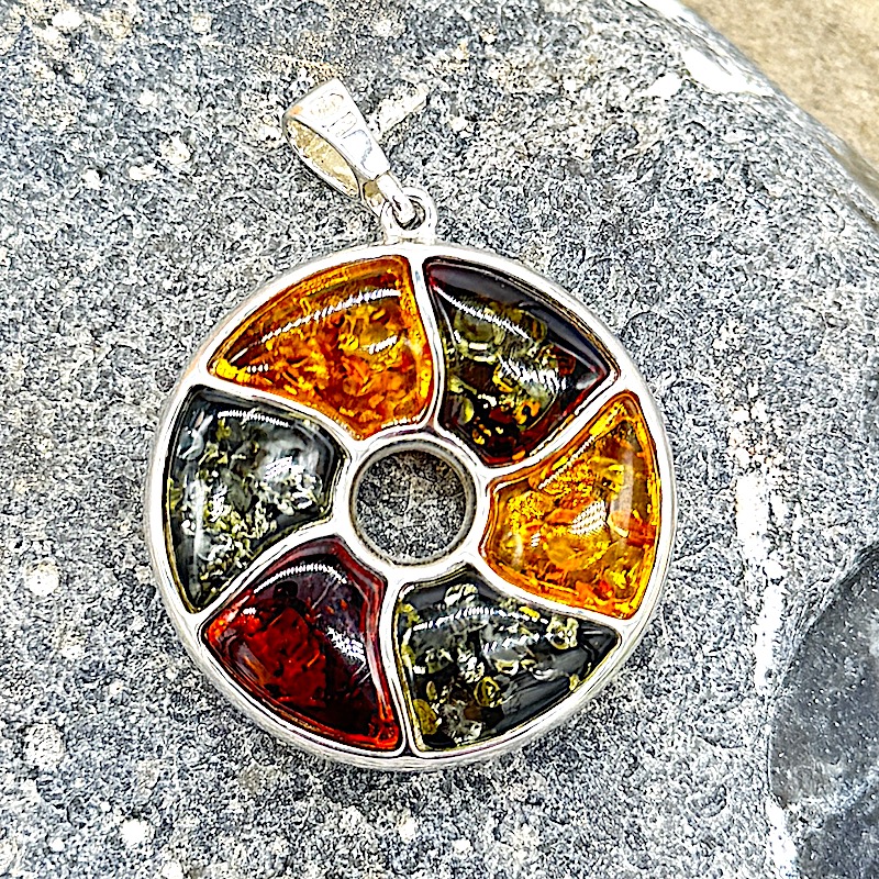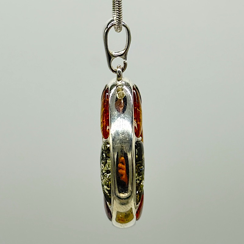 Du kannst ihn von beiden Seiten tragen, denn die Fassung geht um die verarbeiteten Bernsteinstücke…