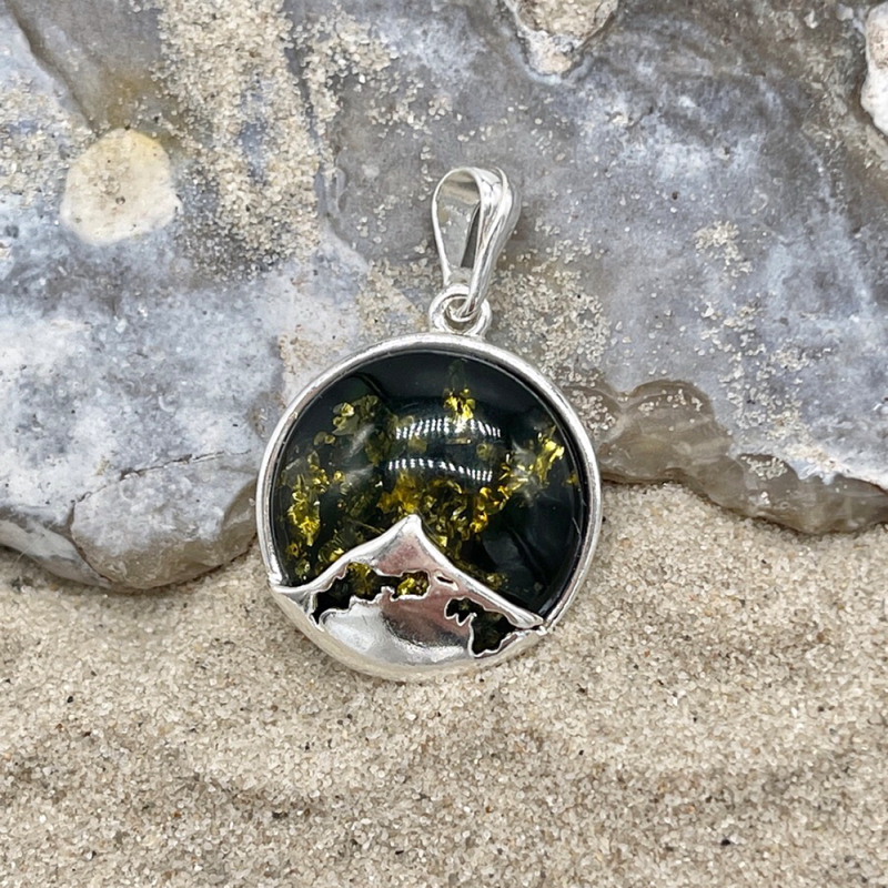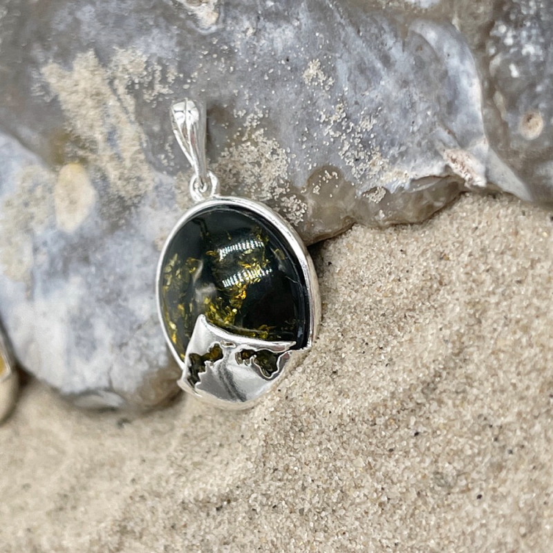Wunderschöner besonderer Kettenanhänger, kunstvoll gefertigt aus 925er-Sterling-Silber und grünem Ostseebernstein. Er zeigt auf der Oberfläche die Halbinsel Fischland-Darß-Zingst – ein echter Hingucker!