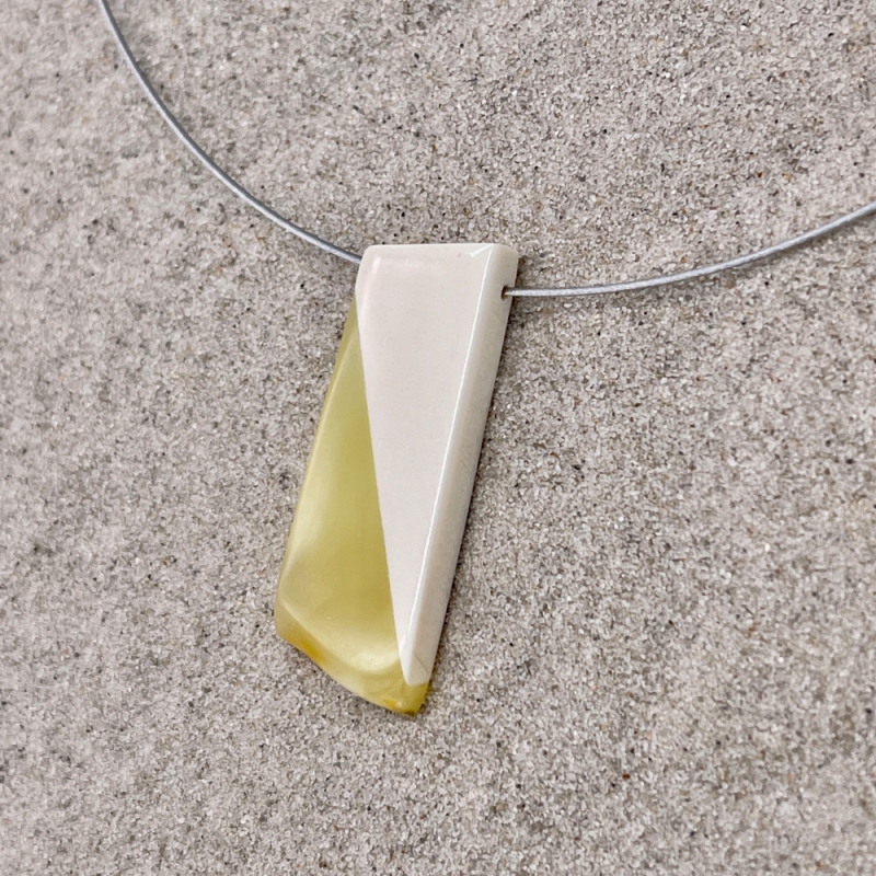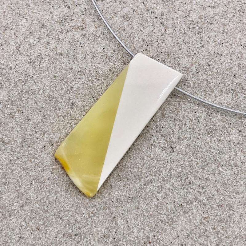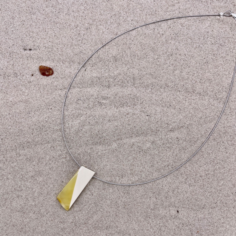 Hier: Edler, filigraner Anhänger verarbeitet mit Mammutbein und Darsser Ostseebernstein an der Stahlseide.