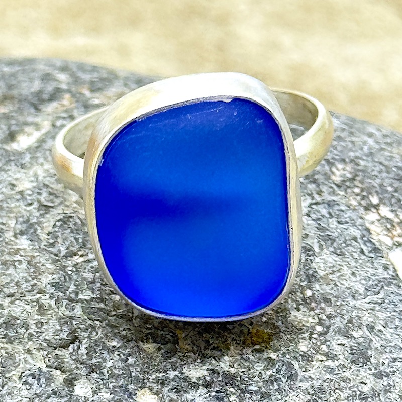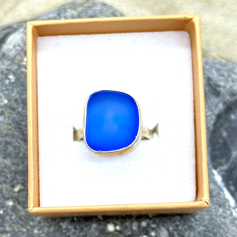 Exclusiver größenverstellbarer Ring mit Strandglas, verarbeitet in edlem 925er Sterling Silber, der Lust auf Meer macht.